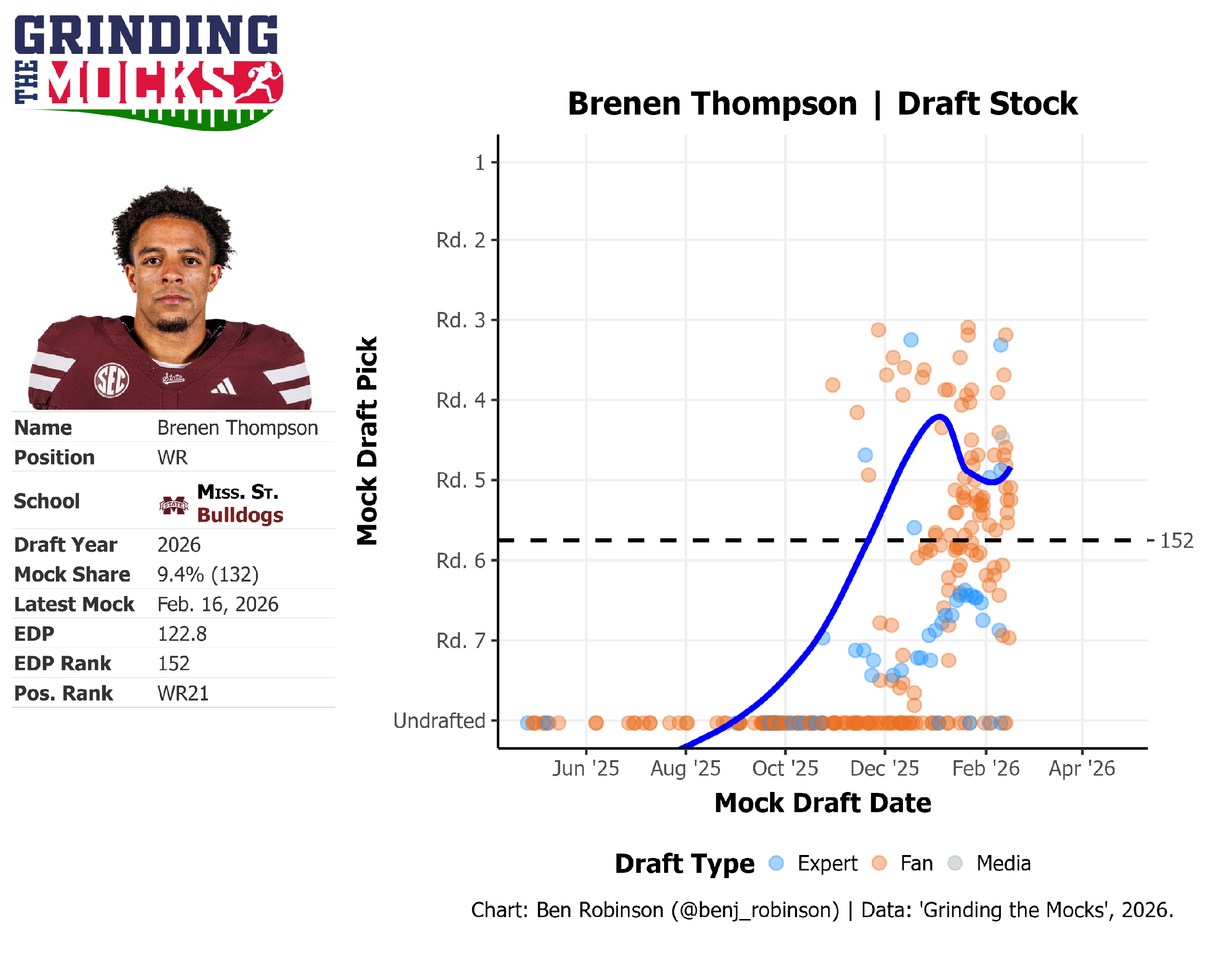 There will be plenty of talk about Mississippi State WR Brenen Thompson’s stock “rising” after the combine. In fact, it wouldn’t surprise me if he got a pretty big “bump” coming out of the Combine. In an effort to keep things in perspective, I will pre-empt that discussion by saying that if a prospect is already considered the WR21 and has an Expected Draft Position in the Day 3 range, he’s probably a Day 3 prospect.