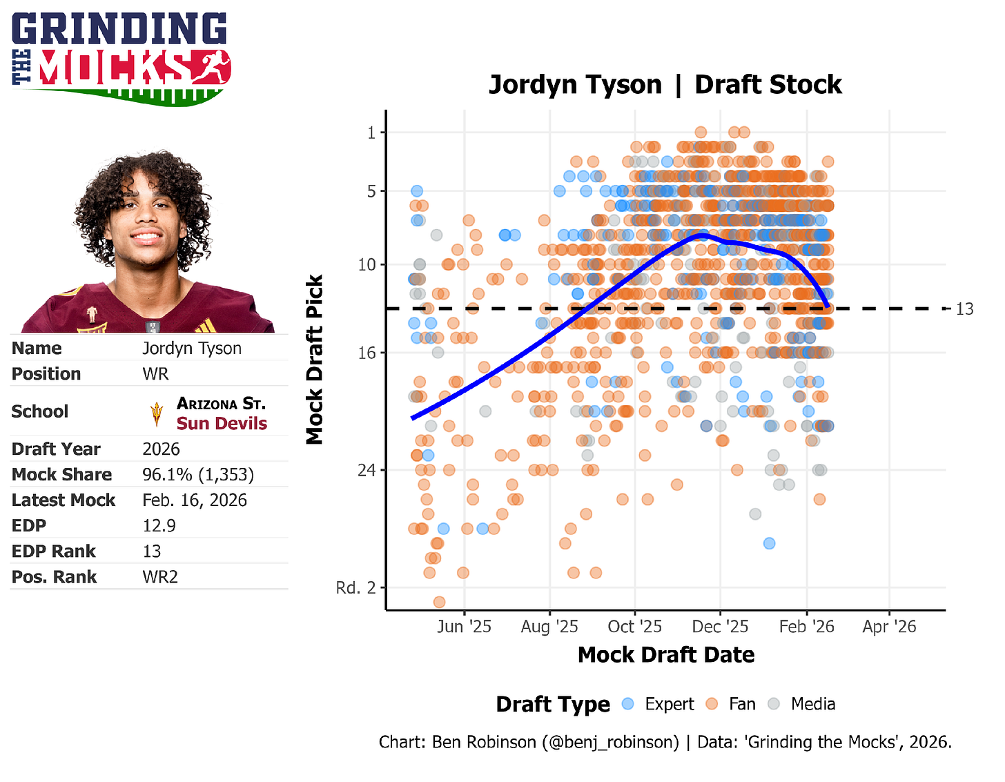 Jordyn Tyson, WR, Arizona State (11th Post-Deadline → 13th Pre-Combine)