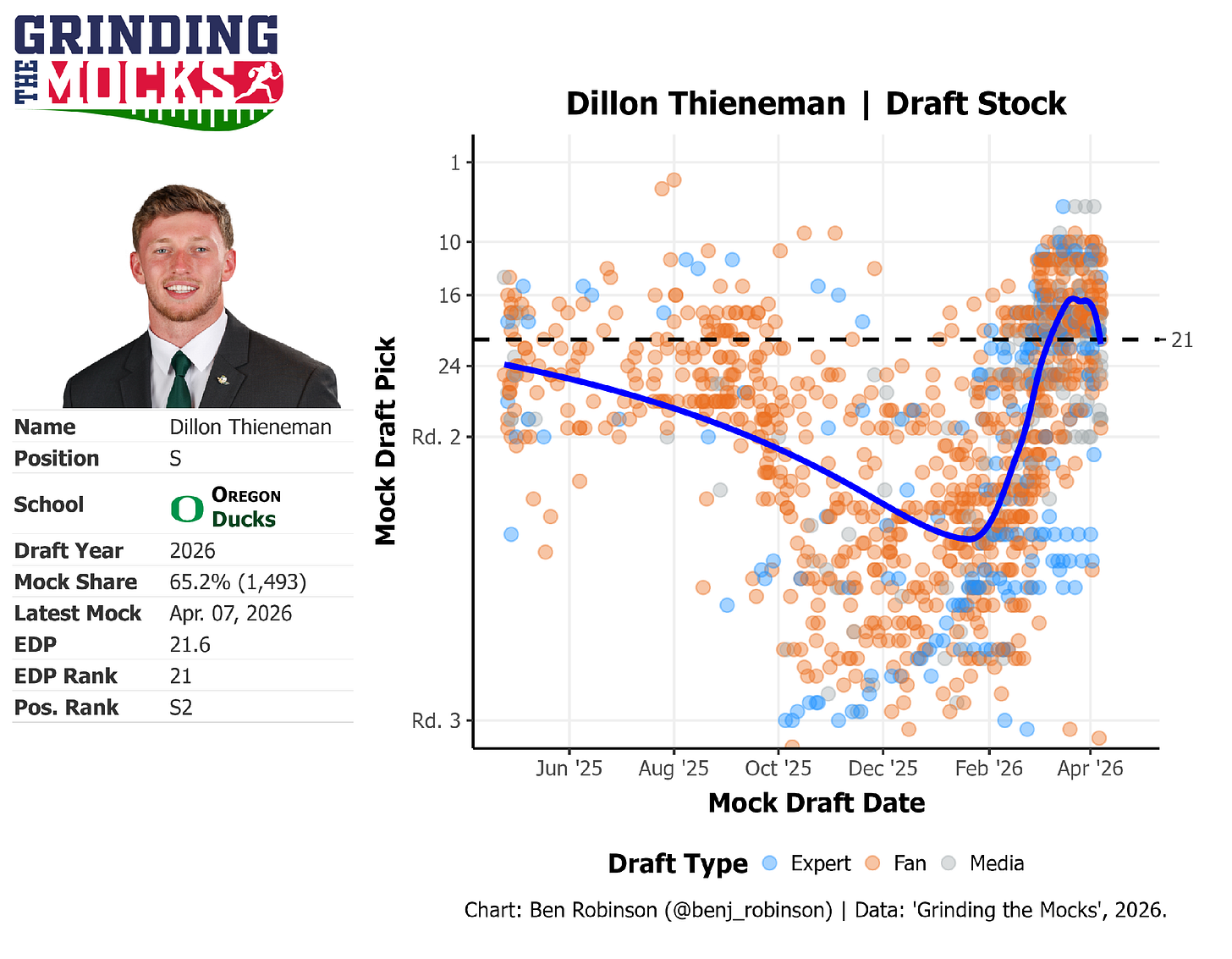 After the combine, Thieneman’s rise was really extreme. He was due for some regression and has been falling ever since. Wide range of potential draft outcomes!
