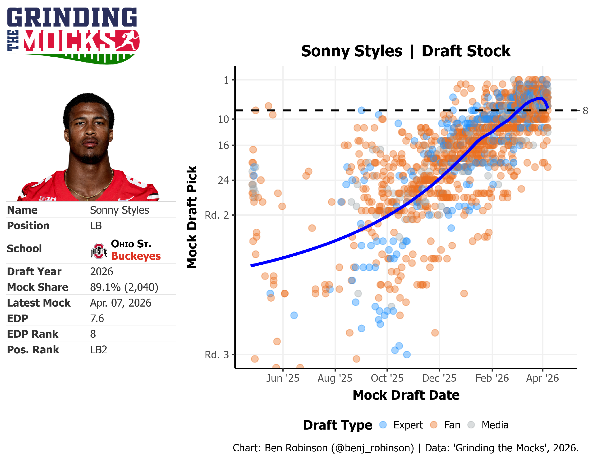 Sonny Styles went from being outside the Top 10 before the combine to being inside the Top 5 after. Now, he’s fallen inside the Top 10 with Top 5 potential. Superb player!