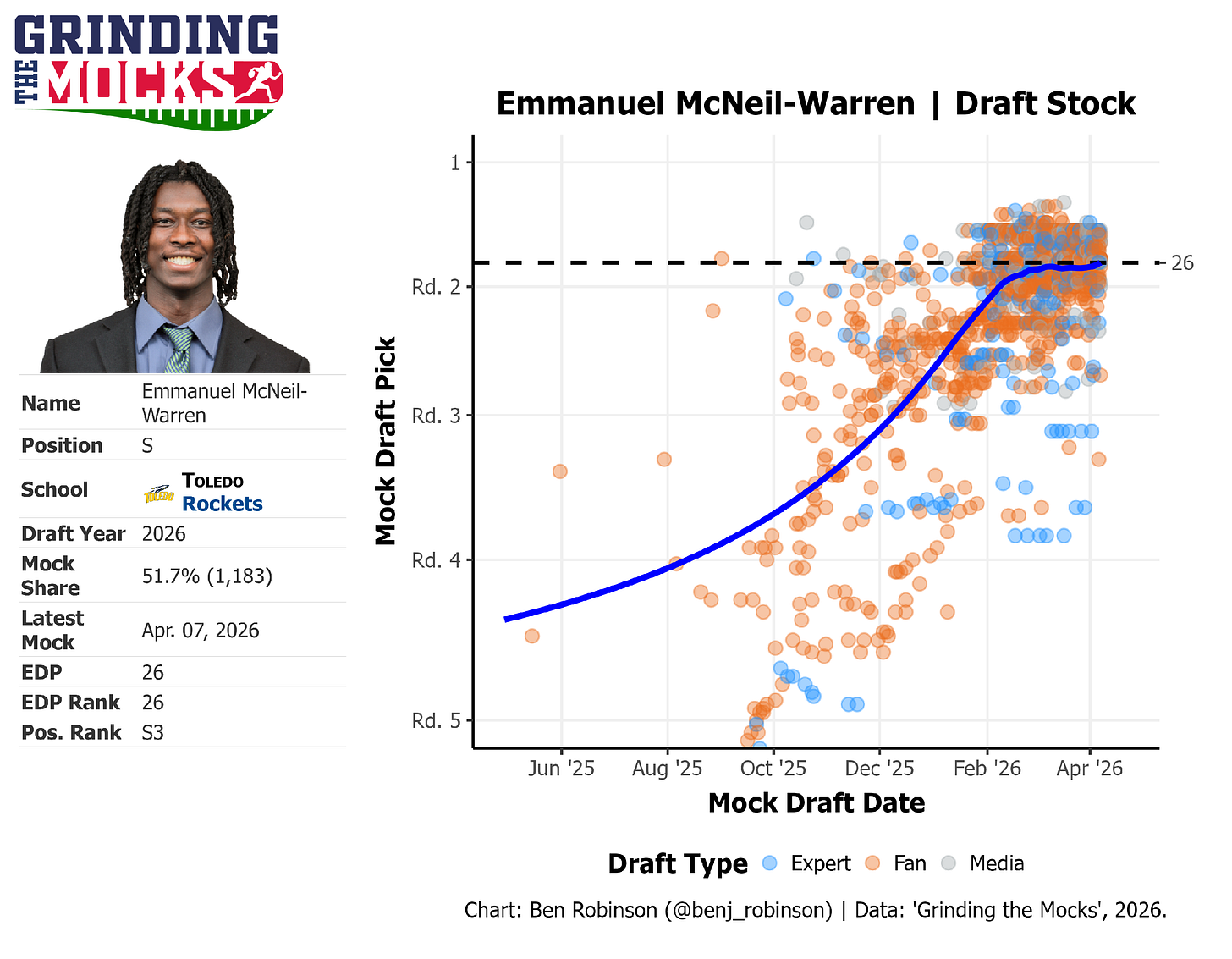 The last time a DB from Toledo was in the Round 1 conversation, Quinyon Mitchell went later than his EDP. McNeil-Warren isn’t as highly rated but is universally liked!