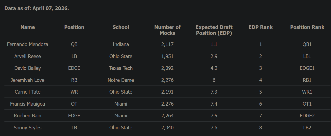 Here we are, with two weeks left. The next version of this article will come out on the Monday of Draft Week! So be prepared to be without your precious “Risers and Fallers” content for a week. I decided to look back at the Post-Combine numbers to pick out these prospects because there actually hasn’t been much raw player movement since our last update a month ago. Player ranks are changing to a certain extent but their underlying Expected Draft Positions are moving only slightly. This indicates that there is a clumping of players around a bunch of different draft positions that is still waiting to be settled. After Arvel Reese and David Bailey, it’s very clumped, especially with 4 players with an EDP in the 7 range from 5-8. Drama!